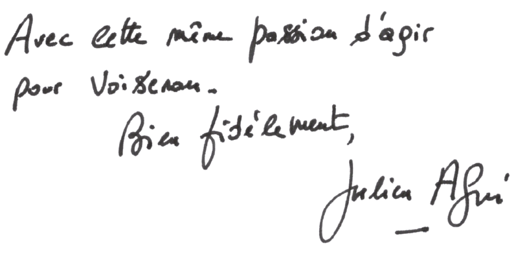Écrivons une nouvelle page d’histoire ensemble. Construisons cette impulsion nouvelle pour perpétuer l’exception voisenonaise que nous sommes venus chercher et que nous souhaitons préserver.